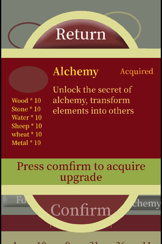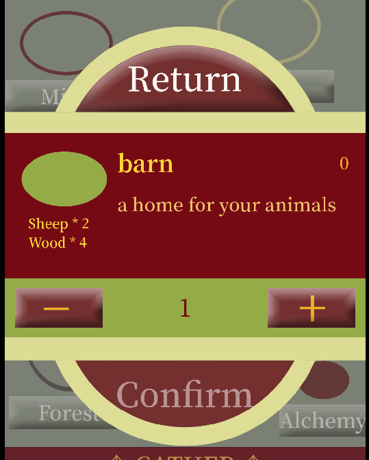 There are a couple places where I need a frame for things: building details, settings, and narrative introduction. In an ideal world I'd make something new for all of them, but the reality is I have 3 weeks left to have something presentable and I also have other things lined up so I need to be as efficient as I can in my design. I've learned from my uni capstone project Mens Mala that once I have a design for a frame I can stick it everywhere. It's always better than default and at least keeps the style consistent. I picked the circle and square layout from the start menu. The square is easily stretchable so the height can change depending on what content is in there. Above is an example of how the this frame is used in the build prompt popup.